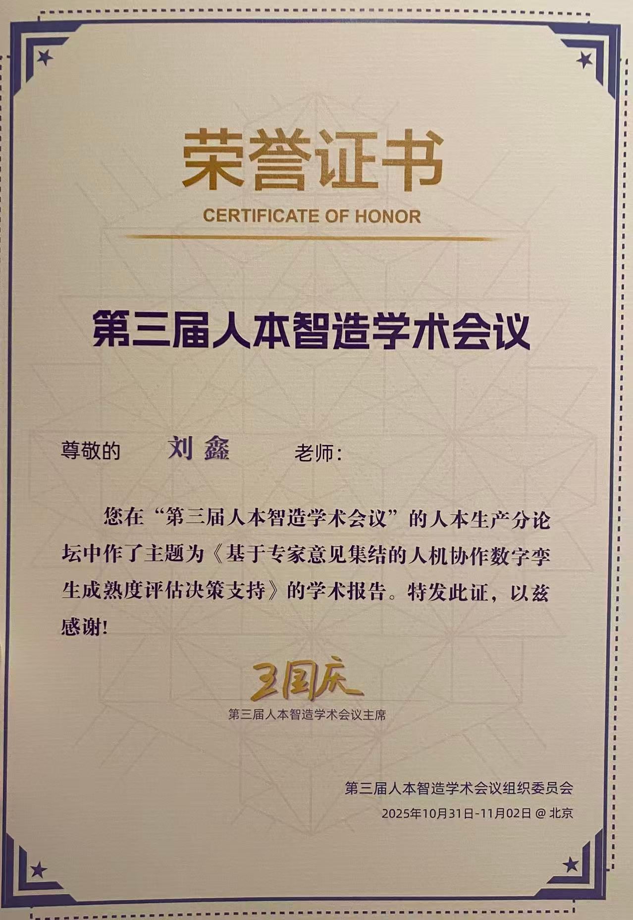 2025年10月31日至11月2日,第三届人本智造学术会议在北京成功召开。本次会议由中国机械工程学会指导,北京理工大学主办,高端装备知识与数据融合应用工信部重点实验室、《机械工程学报》编辑部等多家单位联合承办,吸引了来自浙江大学、香港理工大学、瑞典皇家理工学院、东南大学等海内外高校及科研机构的专家学者齐聚一堂,深入交流人本智造领域的前沿进展。机仪学院教师刘鑫应邀在“人本生产”分论坛作题为《基于专家意见集结的人机协作数字孪生成熟度评估决策支持》的专题报告。报告指出,安全可靠的智能人机协作是实现人本智造的重要基础,而数字孪生技术是构建智能人机协作范式的关键使能技术之一。针对当前缺乏对人机协作数字孪生效能量化评估的问题,构建了一套涵盖5个维度、24个评价因子及5级成熟度的评估模型,并提出了一种基于专家意见集结的量化评估方法。报告内容引起了与会专家的广泛关注与高度评价,现场交流气氛热烈。通过此次学术分享,不仅展示了学院和课题组的科研成果,也进一步加强了与国内外高校及产业界同行的科研合作与学术联系。相关成果发表在《Journal of Industrial Information Integration》(中科院一区TOP,IF:11.6)