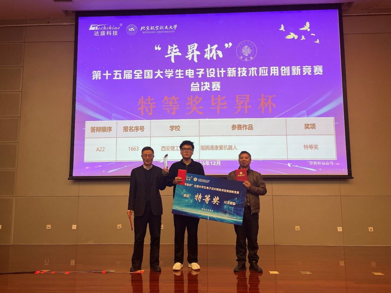 2025年12月13日,第十五届“毕昇杯” 全国大学生电子设计新技术应用创新竞赛决赛在北京航空航天大学圆满落幕。我校机械工程学院王荪馨教授指导的梁钰、安帅民、孙翌超、王宝瑫四位同学组成的参赛团队,在全国125支决赛参赛队伍中脱颖而出,成功捧杯,实现我校在该赛事中的历史性突破。